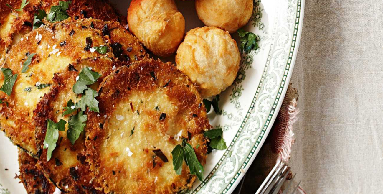 Flour the eggplants and dip in beaten eggs that have been seasoned with salt and pepper.